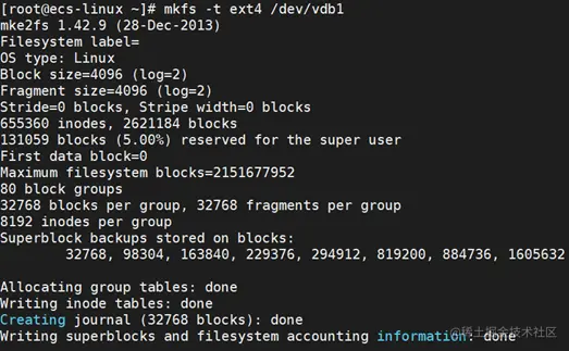执行以下命令,把新建分区文件系统设为系统所需格式,mkfs -t 文件系统格式 /dev/vdb1,这里来设置文件系统为“ext4”为例: