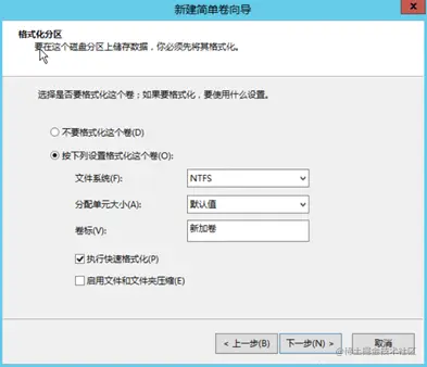 勾选“按下列设置格式化这个卷”,并根据实际情况设置参数,格式化新分区,单击“下一步”完成分区创建
