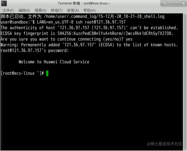 回到【实验操作桌面】,双击“Xfce终端”打开Terminal,执行如下命令(使用弹性公网IP地址替换命令中的EIP),登录弹性云服务器ECS