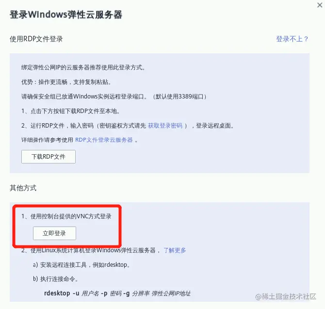 使用其他方式(VNC)登录,点击“立即登录”这个简单,第一种要下RDP文件麻烦一点,要绑定弹性公网EIP 放弃哈哈