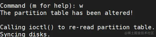 表示新建分区“/dev/vdb1”的详细信息,输入“w”,按回车键“Enter”,可以把分区结果写入分区表里面去啦;