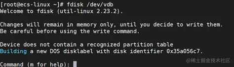 执行下面命令,进入fdisk分区工具,开始对新增数据盘执行分区操作,fdisk新增数据盘,以新挂载的数据盘“/dev/vdb”为例: