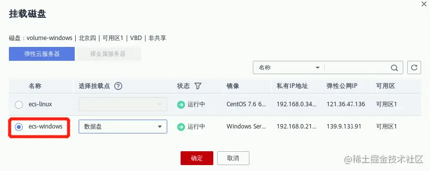 选择云硬盘EVS待挂载的弹性云服务器ECS,此处我们选择ecs-windows,该弹性云服务器ECS必须与云硬盘EVS位于同一个可用分区哈这个前面我已经讲过的,通过下拉列表选择“挂载点”,挂载点是数据盘,单击“确认”;