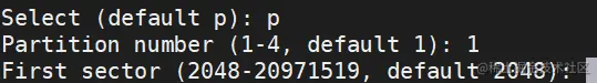 “First sector”表示初始磁柱区域,我们可以选择2048-20971519这个范围,默认为2048;还是以选择默认初始磁柱编号2048为例,不输入命令,直接按回车键“Enter”即可啦;