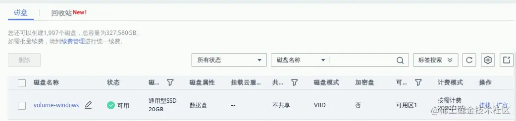 返回“磁盘列表”。在“云硬盘EVS”主页面,就能查看云硬盘EVS状态,待云硬盘EVS状态变为“可用”时,表明创建成功,并且可以进行挂载及扩容操作;