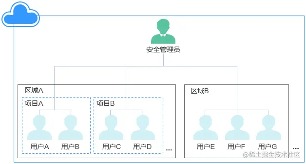 对于一个租户而言,区域以及项目下的用户关系示意图看下面,以区域B为例,根据首次使用加密功能的用户是否拥有“Security Administrator”权限分为以下两个场景: