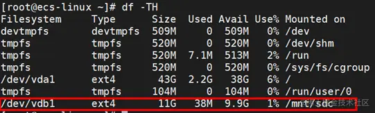 执行以下命令,把新建分区挂载到上步新建的挂载点下,这里还是挂载新建分区至“/mnt/sdc”为例: