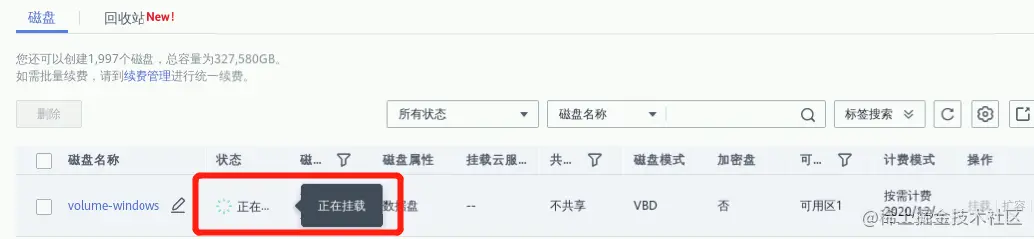 返回云硬盘EVS列表页面,此时云硬盘EVS状态为“正在挂载”,表示云硬盘EVS处于正在挂载至弹性云服务器ECS的过程中,当云硬盘EVS状态为“正在使用”时,表示挂载至弹性云服务器ECS成功,下一步进行初始化就能正常使用啦;