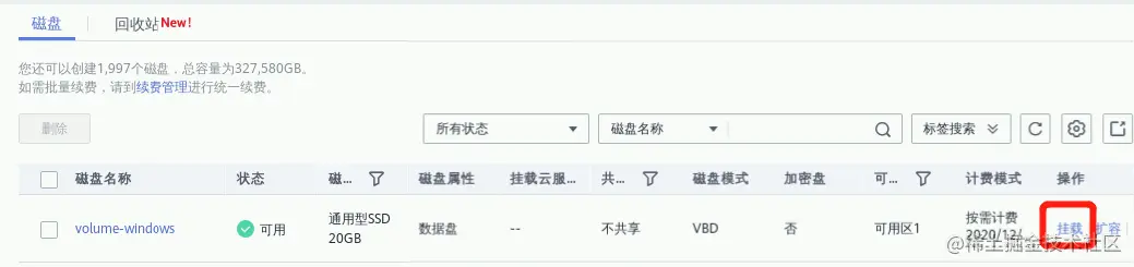 在云硬盘EVS列表,找到我们所创建的云硬盘,然后点击右侧操作中的【挂载】,弹出挂载磁盘配置窗口完成配置就行