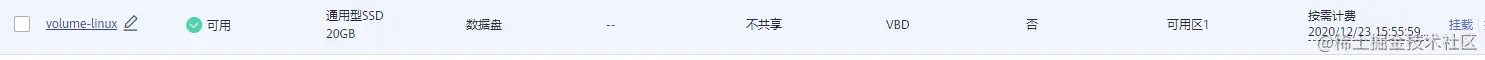 在云硬盘EVS列表,找到我们所创建的云硬盘volume-linux,点击右侧操作中的【挂载】,弹出挂载磁盘配置窗口