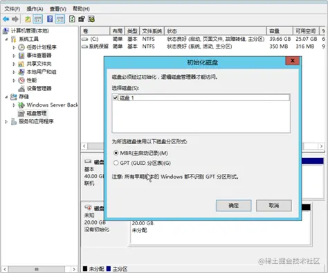 在左侧导航树里面,选择 存储 –> 磁盘管理,进入“磁盘管理”页面,假如新挂载磁盘显示为“没有初始化”,则右键单击在菜单列表中选择“初始化磁盘”。在“初始化磁盘”对话框中显示需要初始化的磁盘,选中“MBR(主启动记录)”或者“GPT (GUID 分区表)”,单击“确定”完成设置