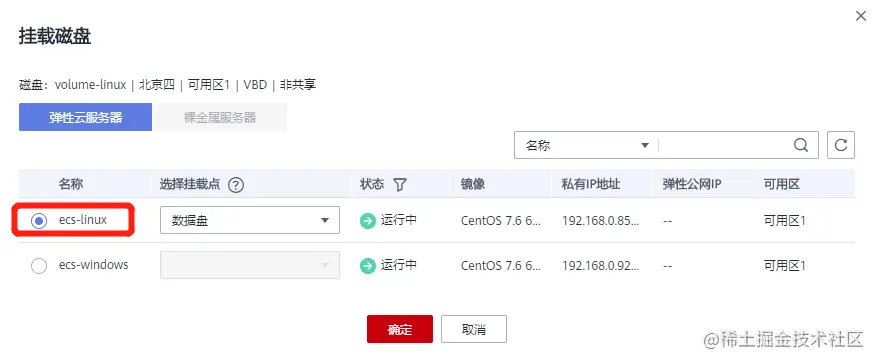 然后选云硬盘EVS待挂载的弹性云服务器ECS,此处我们选择ecs-linux,该弹性云服务器ECS必须与云硬盘EVS位于同一个可用分区,通过下拉列表选择“挂载点”,挂载点为数据盘,单击“确认”