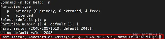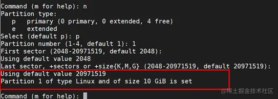 另外“Last sector”表示截止磁柱区域,可以选择2048-20971519,默认为20971519,这里我选择默认截止磁柱编号20971519为例,不输入命令,直接按回车键“Enter”即可;
