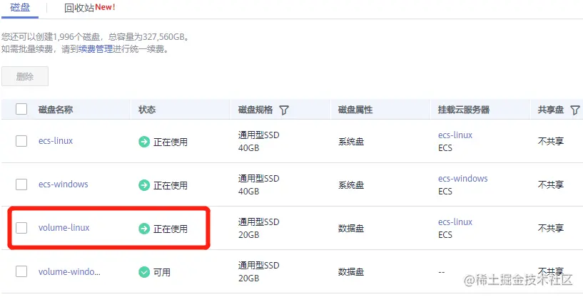 单独购买的云硬盘EVS为数据盘,可以在云硬盘EVS列表中看到磁盘属性为“数据盘”,磁盘状态为“可用”。此时需要将该数据盘挂载给弹性云服务器ECS使用。