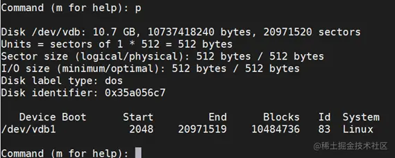 上面表示分区完成,即为10GB的数据盘新建了1个分区,然后输入“p”,按回车键“Enter”,就能查看新建分区的详细信息;