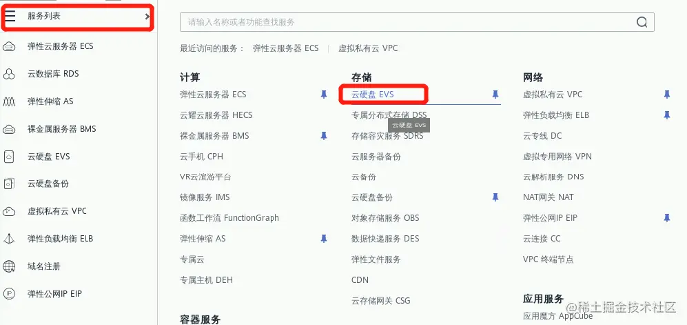 云硬盘EVS挂载至弹性云服务器ECS后,需要登录弹性云服务器ECS初始化云硬盘EVS,即格式化云硬盘EVS,之后云硬盘EVS才可以正常使用,选择“服务列表>弹性云服务器ECS”。进入弹性云服务器ECS页面;