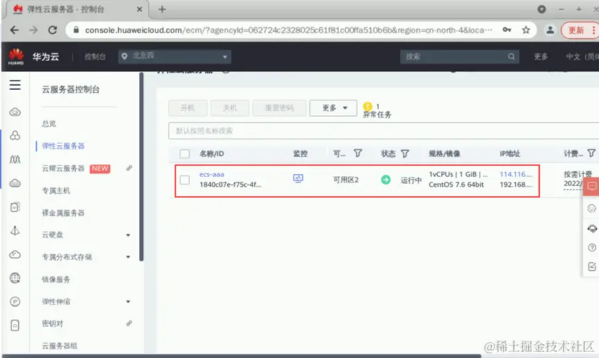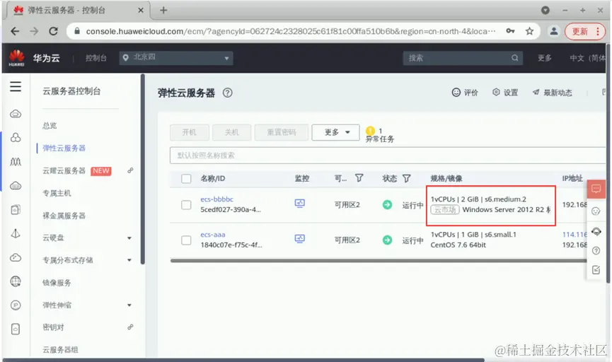 点击“立即购买” -> “返回云服务列表”,云服务器列表中此时有两台弹性云服务器,如下图所示: