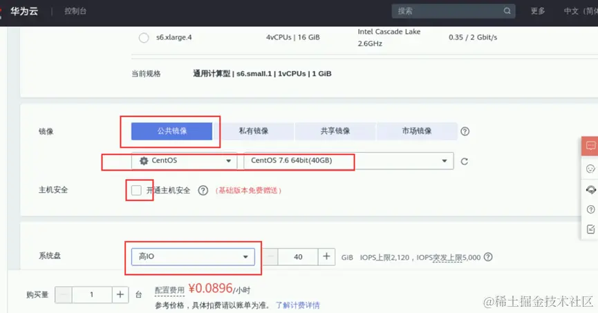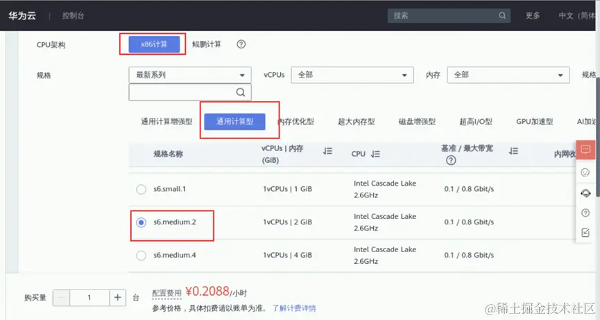④ 规格:通用计算型,s6.medium.2 | 1vCPUs | 2GB,