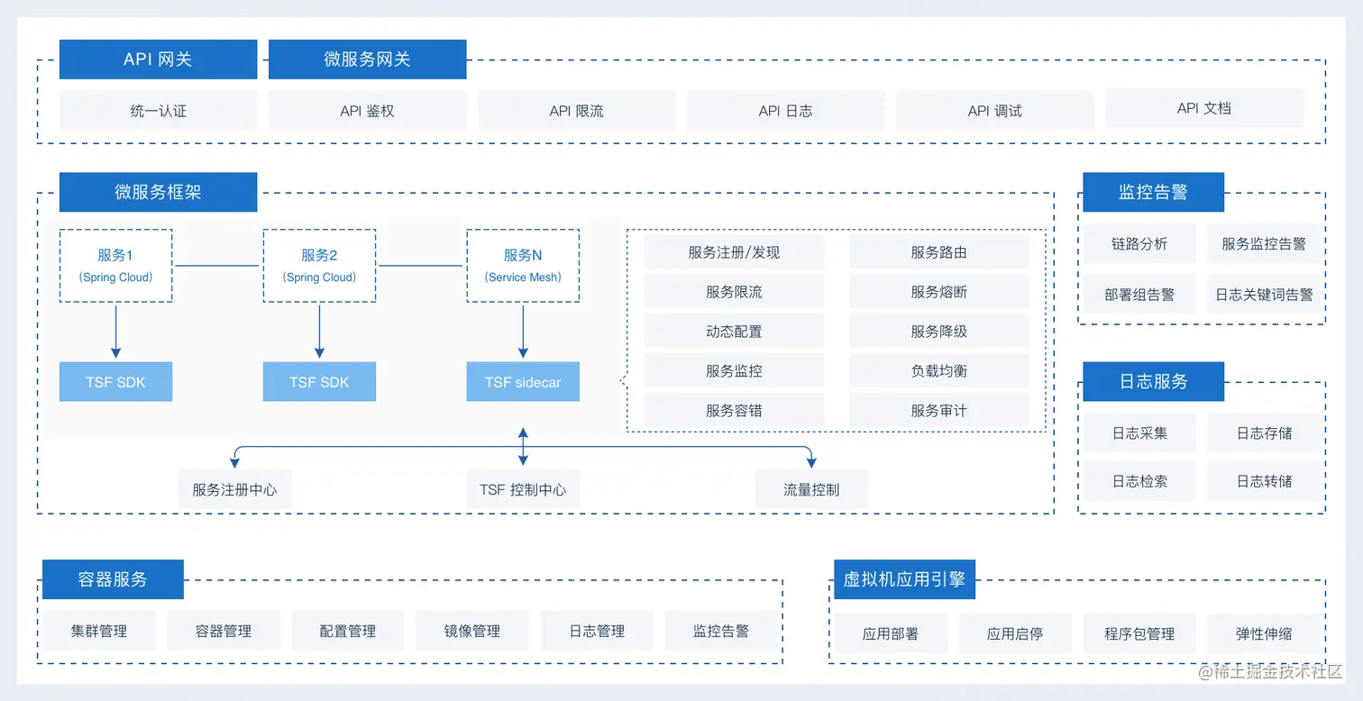本实战系列主要讨论范围包括TSF平台中服务路由、服务鉴权、服务限流、服务熔断容错、服务可观测性、服务配置等服务治理核心能力(如下图“微服务框架”中所示)。