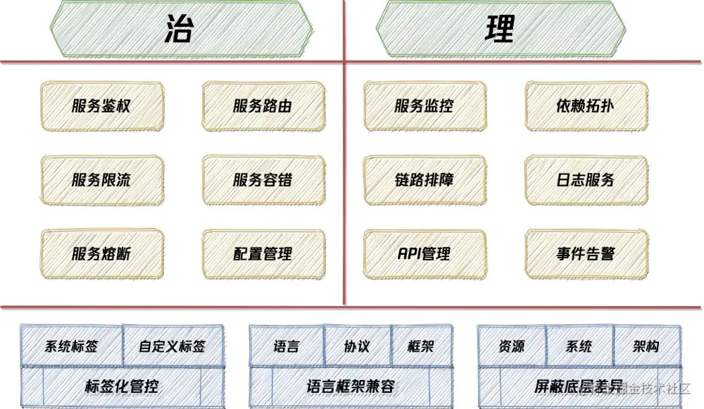 治是主动的管理动作,包括针对安全的服务鉴权,针对流量的服务限流、服务路由、服务熔断,针对可用性的服务容错,针对配置的应用配置、日志配置等。