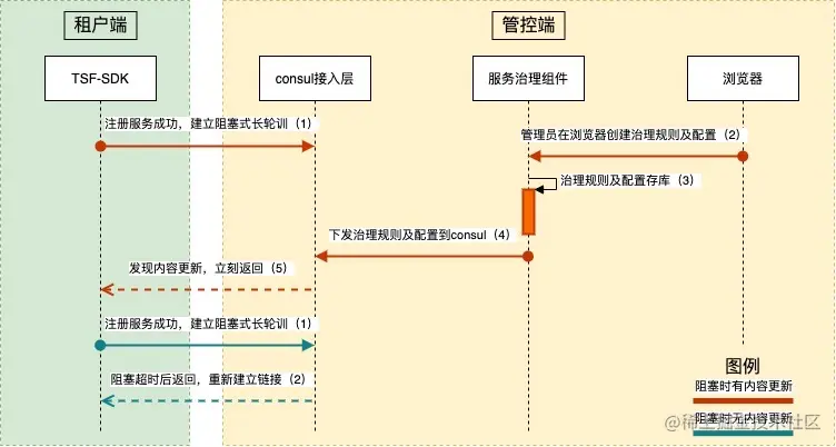 TSF-SDK的整个监听过程分为两种情况:阻塞时有内容更新、阻塞时无内容更新。在服务(应用)完成注册发现之后,TSF-SDK向Consul接入层发起一个长轮询请求,以便应用侧可以实时上报数据,同时实时接收管控端下发的规则、应用配置等数据。当在长轮询请求有效期内发生了治理规则推送,那么长轮询请求立刻返回被更新的内容给TSF-SDK;当长轮询请求持续等待直到超过了最大等待时间,请求也会返回,同时发起下次长轮询请求,以避免连接无限期等待带来的风险。