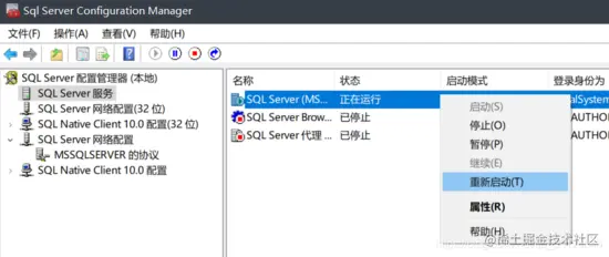 随后,也是很重要的一步,打开刚刚的sql sever配置管理器,重启sql sever服务。