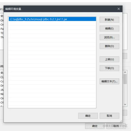 然后在下面的系统变量的 CLASSPATH中将 .;C:sqljdbc_9.2chsmssql-jdbc-9.2.1.jre11.jar 这句话加进去,注意不要复制我的,根据你jdbc文件路径和版本名称进行相应更改,注意前面有个点和分号!