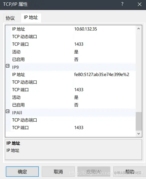 打开之后依次点击SQL SEVER 网络配置->MSSQLSEVER 协议->TcpIp,出现下图界面。