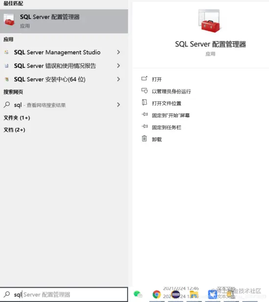 首先,在开始搜索框中搜索 sql sever配置管理器,如下图,我们打开它(如果没有这个软件或者打不开,那说明当初安装sql sever没安装完全,卸载重装一次,找不到不一定就是没有,百度一下怎么找,真找不到就是没安装!)