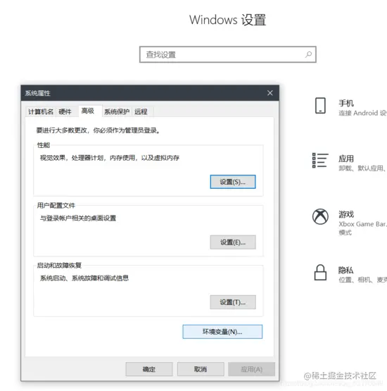 打开设置,搜索 高级系统设置,然后点开环境变量,