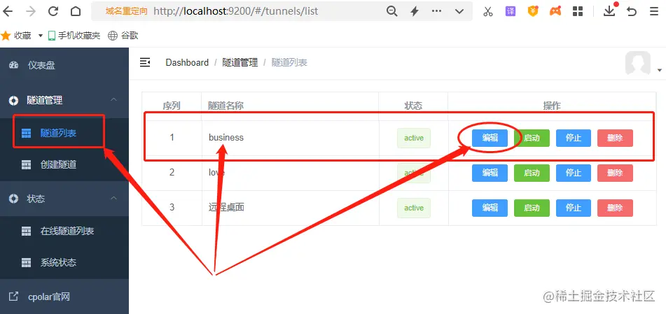 接着我们回到cpolar客户端(可以从开始菜单中选择打开,也可以在浏览器中输入localhost:9200),点击左侧的“隧道列表”项,从中找到我们本地商业网站的数据隧道,点击“编辑”按钮。