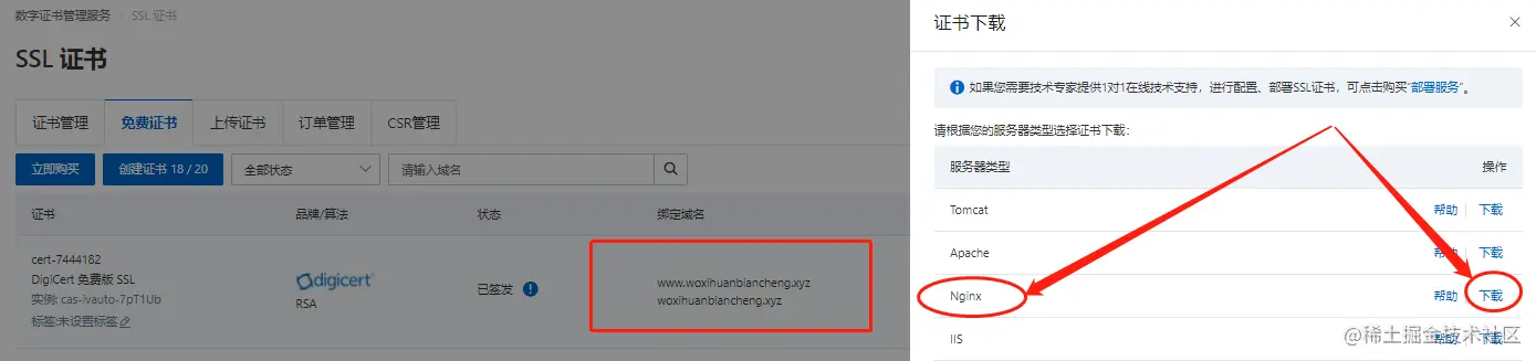 由于证书种类繁多(以适应不同的网页运行环境),因此我们需要下载与本地网页运行环境对应的证书(我们使用的网页运行环境为Nginx,因此需要下载Nginx版本的证书)