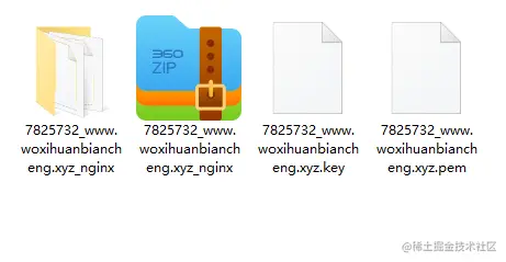 等到安全证书下载完成后,我们在本地电脑上将其解压,获得两份文件(分别为证书的公钥文件和私钥文件,站点证书文件后缀名为.pem;站点密钥文件后缀名为.key)。