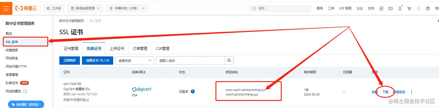 正如前面所述,网站的安全证书还存在阿里云的服务器上,因此我们就需要到阿里云的SSL证书页面,将申请好的证书下载到本地电脑上。