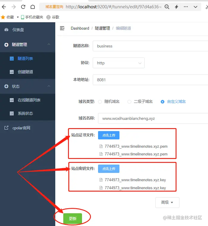 在隧道的编辑页面,我们直接点击“站点证书文件”和“站点密钥文件”,将两个文件对应上传。此处,站点证书文件后缀名为.pem;站点密钥文件后缀名为.key,千万不要搞混!