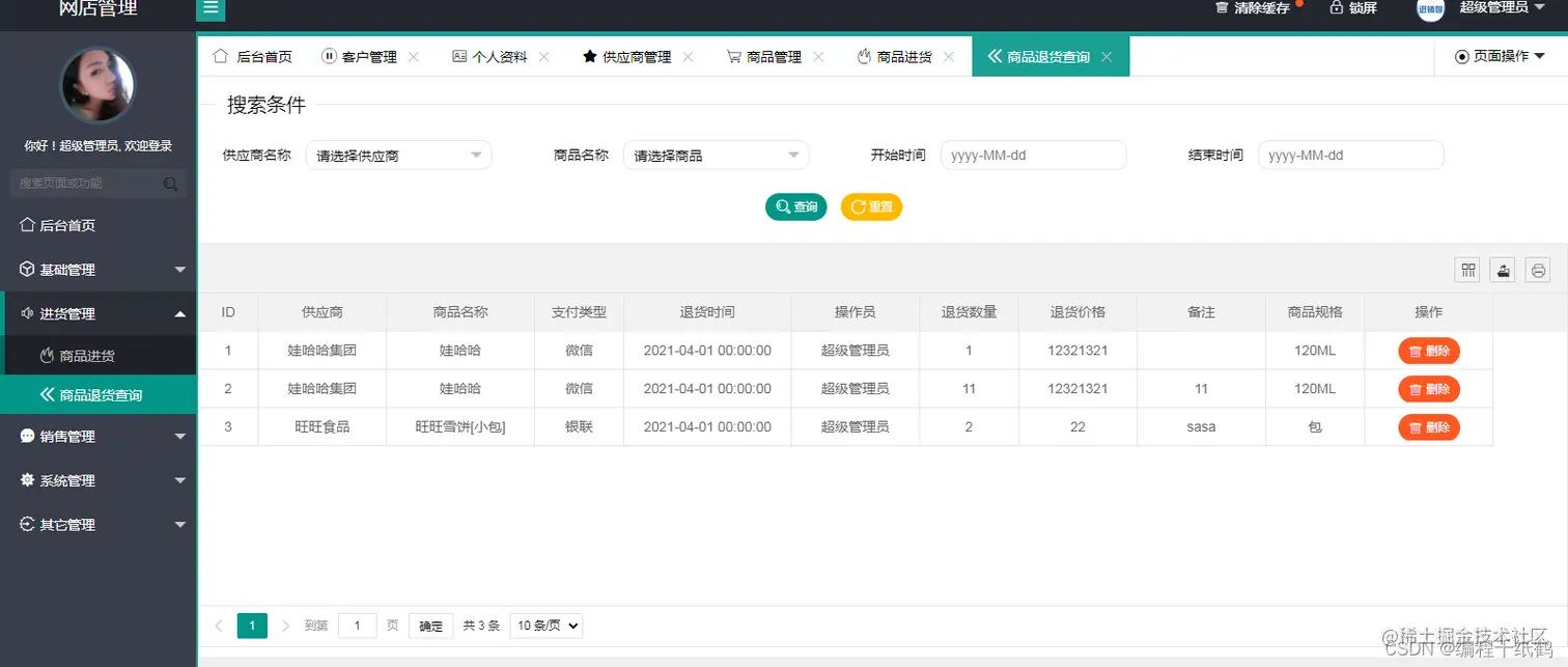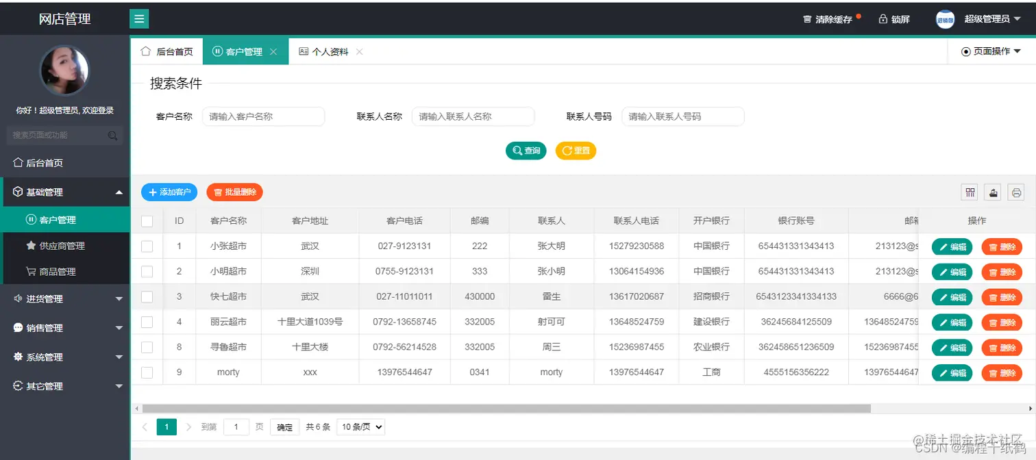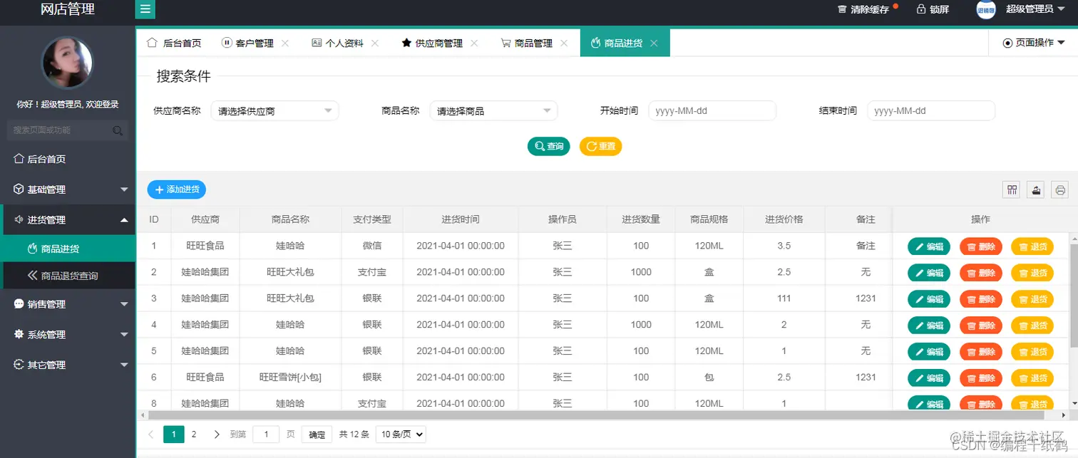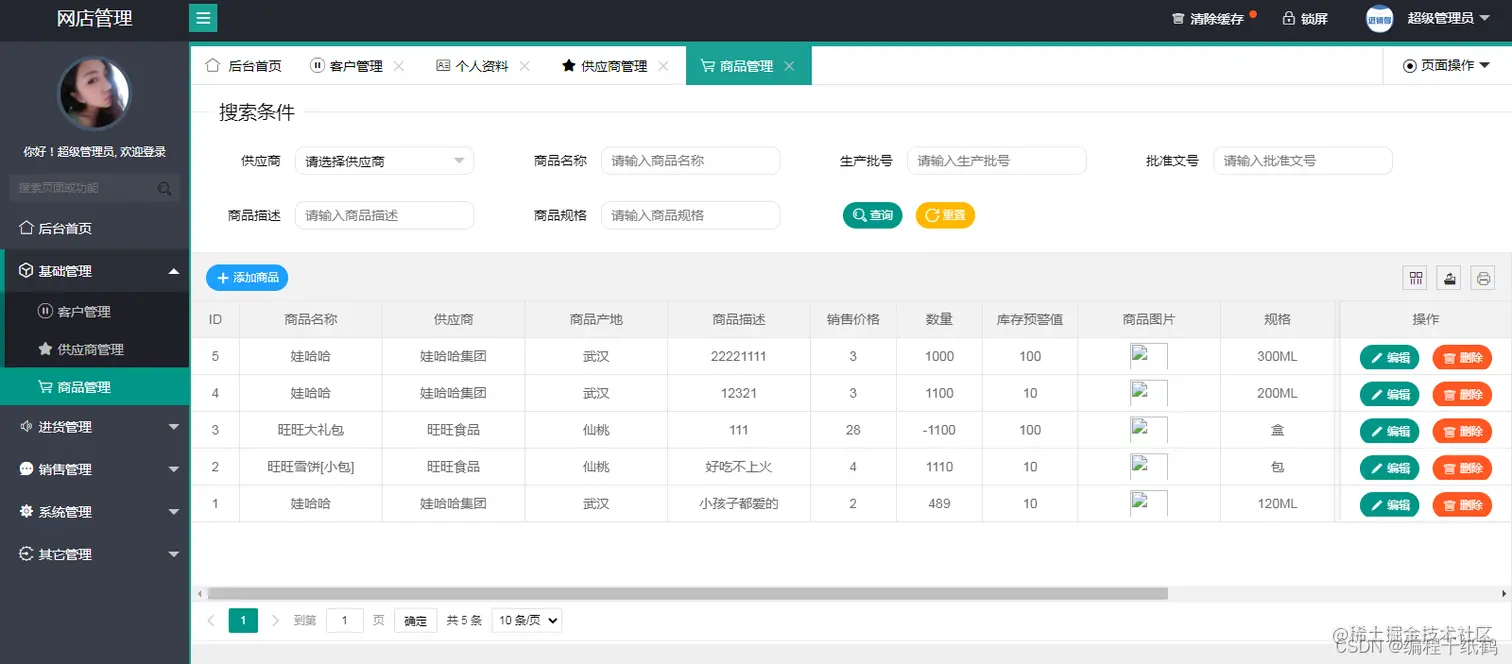 - 基础管理模块:包含客户管理、供应商管理、商品管理三个子模块