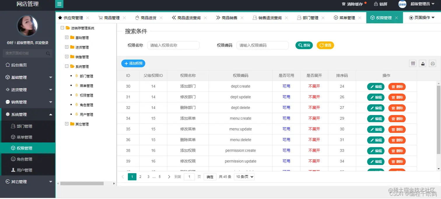 本项目实现了基于springboot的进销存管理系统,主要用户开设网店的相关商品的进货、销售、库存的管理,功能比较完整,有着完备的权限管理系统,可以自行根据需要来设计角色和分配权限,权限的粒度可以做到页面级的权限控制,整个项目来讲比较优秀。主要实现的功能有如下几个模块:
