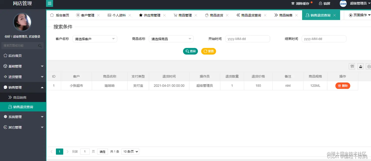 - 销售管理:包含商品销售、退货、销售退货查询几个子查块