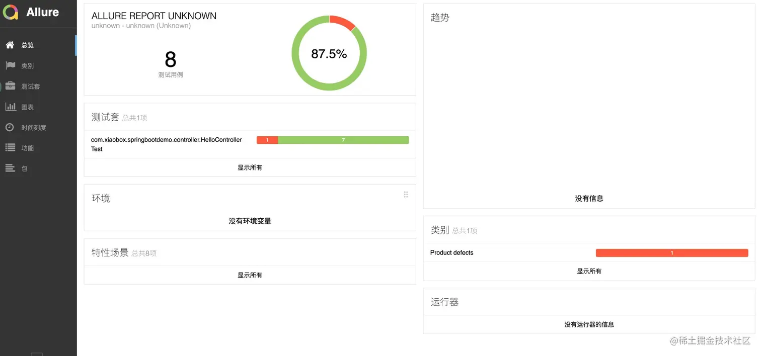 怎么样,还挺好看的吧,我们用的是 Allure 来生成了一个 web 页面,这个页面还有一些简单的交互,整体简洁好看、易用。