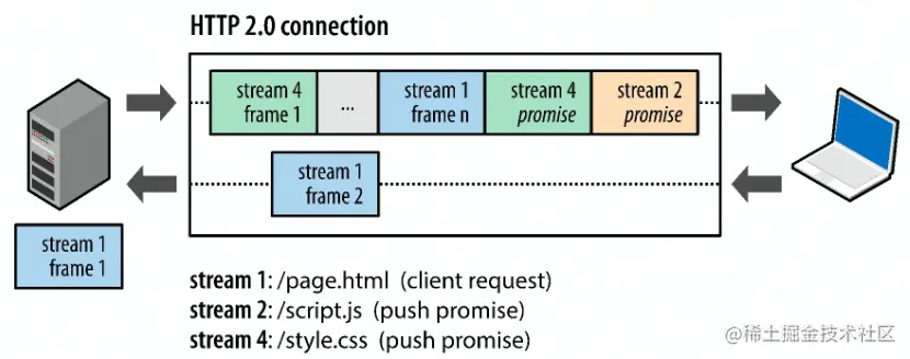 - 服务器推送:服务端向客户端发送比客户端请求更多的数据。这允许服务器直接提供浏览器渲染页面所需资源,而无须浏览器在收到、解析页面后再提起一轮请求,节约了加载时间。