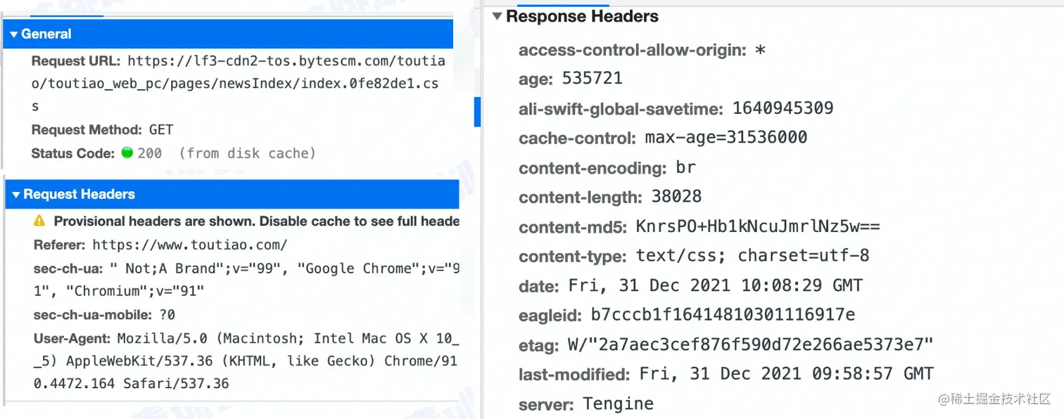 可以看到,状态码为 200,from disk cache 表示来自磁盘缓存,说明这个请求是从本地缓存里拿到的响应。