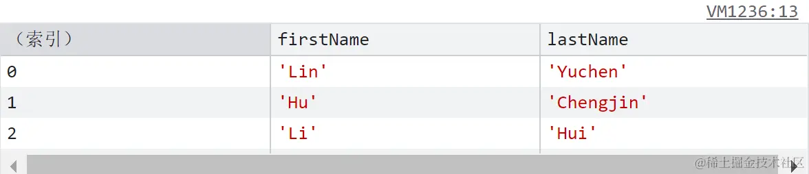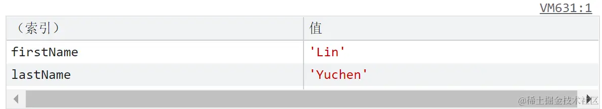 console.table({firstName:"Lin",lastName:"Yuchen"})