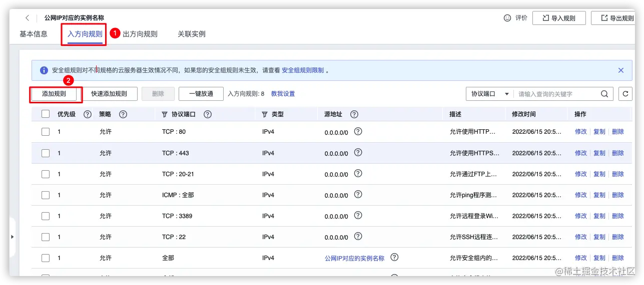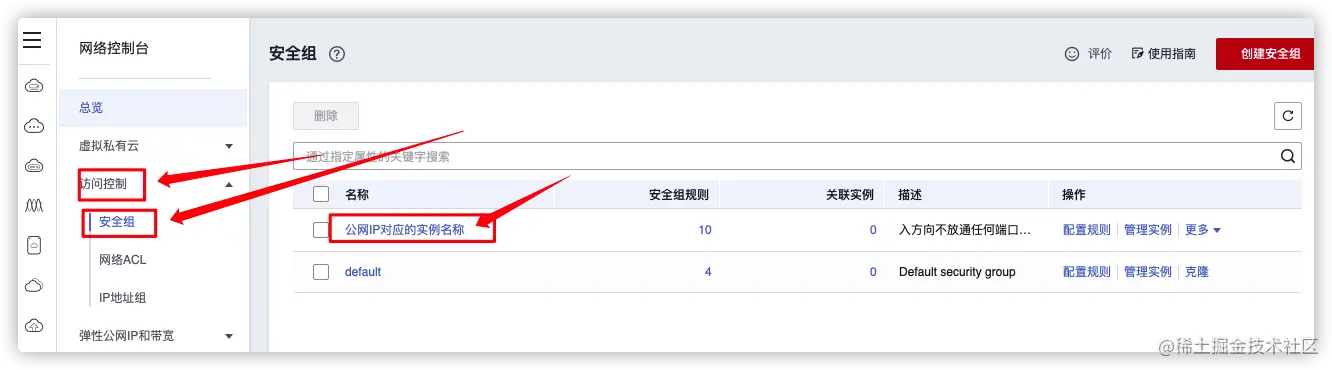 访问控制-->安全组-->和公网IP对应的实例名称,这里因为我没有实际购买弹性公网IP,所以是自定义的安全组,如果购买了公网IP这一条会是和公网IP相同名称的安全组。