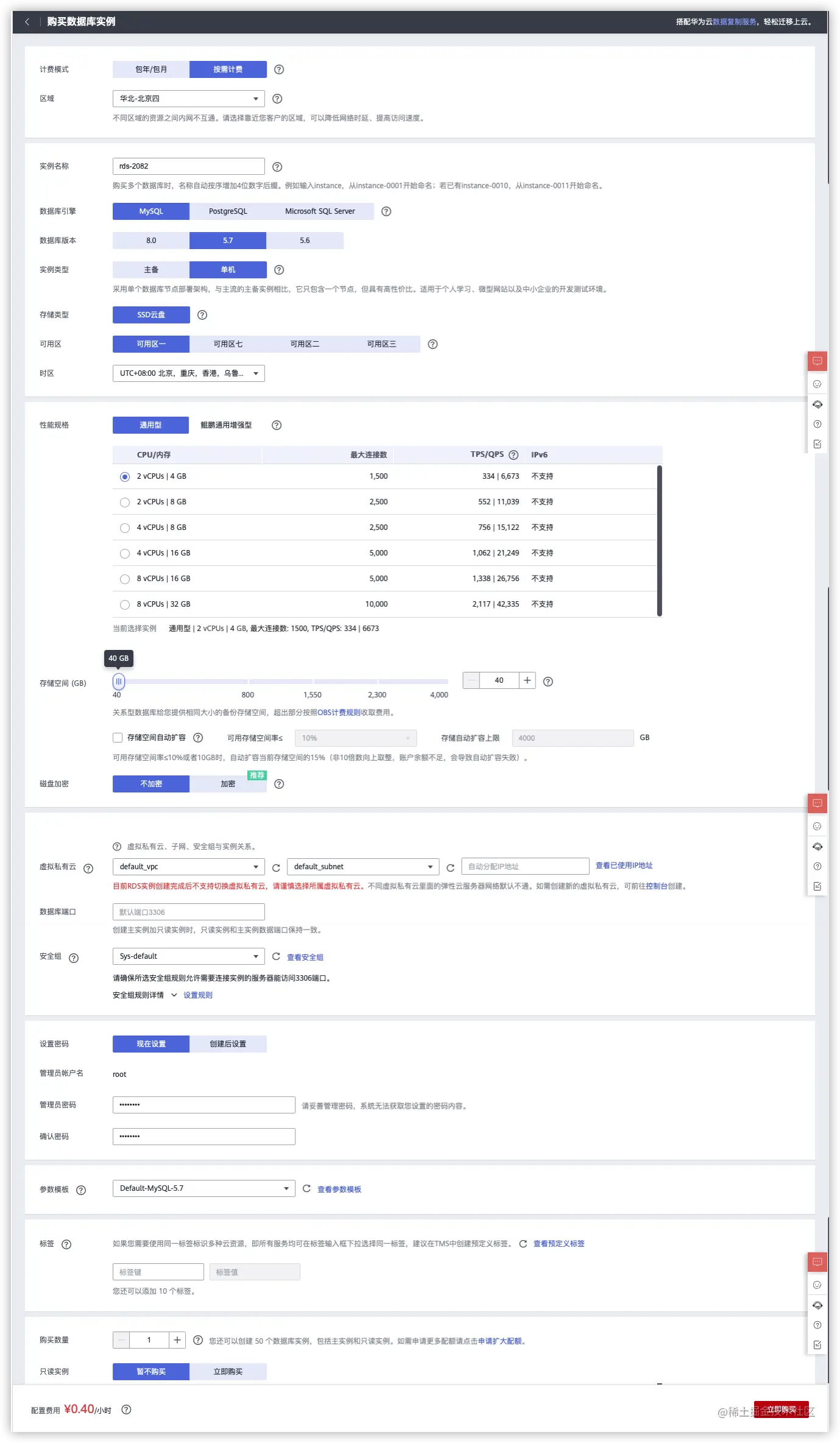 购买数据库实例。 - 选择需要的配置,配置选好以后点击