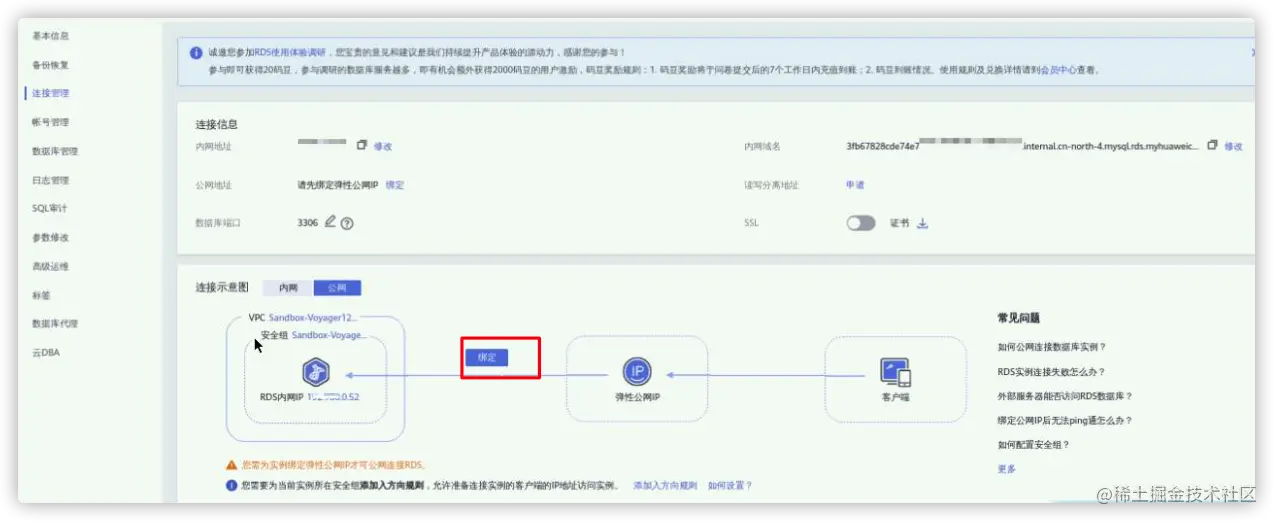 连接管理-->连接示意图-->公网-->绑定