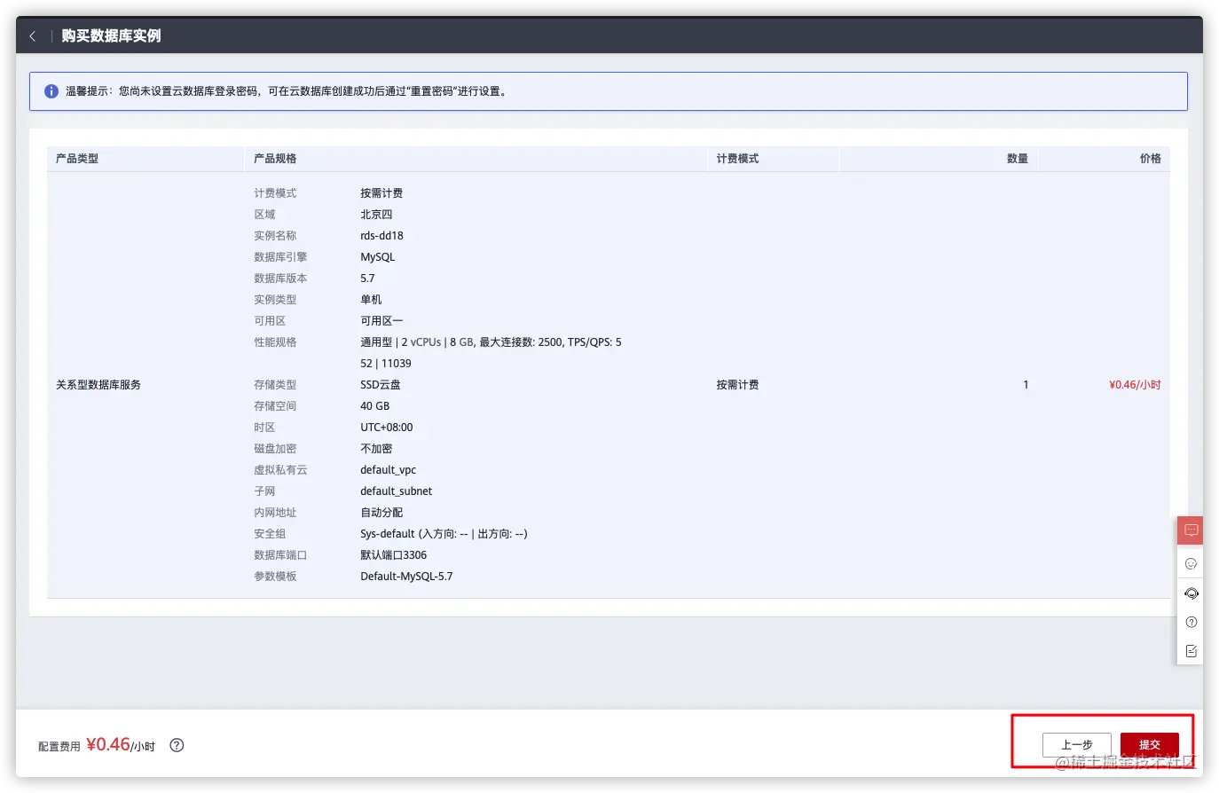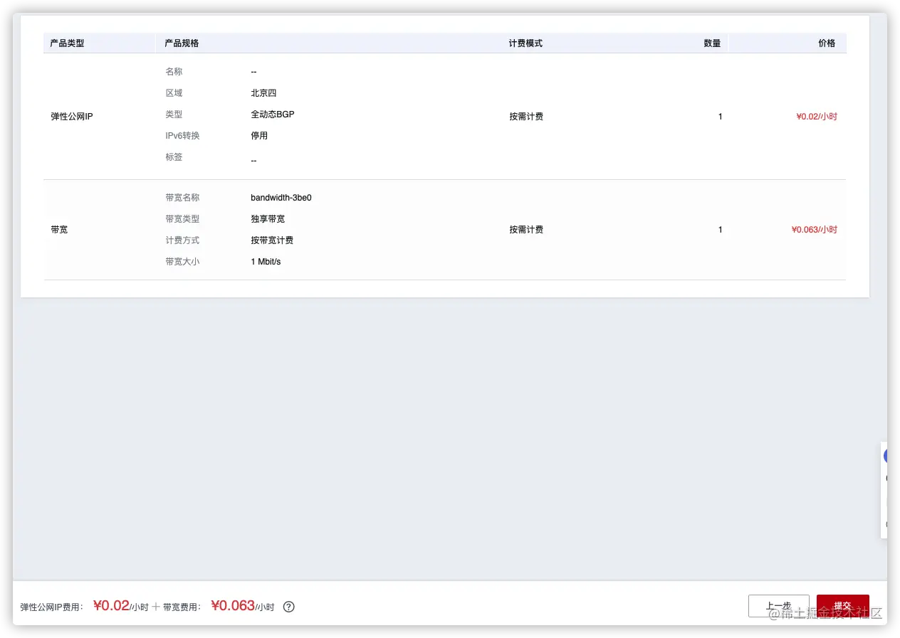 上一步返回重新选择配置,没问题就直接点击提交购买。 - 提交完成即完成购买,点击