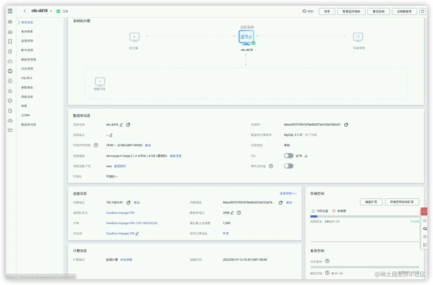 - 创建完成后,点击数据的实例名称,可以查看和编辑数据库的详细信息,其中包括基本配置信息、连接信息、计费信息。