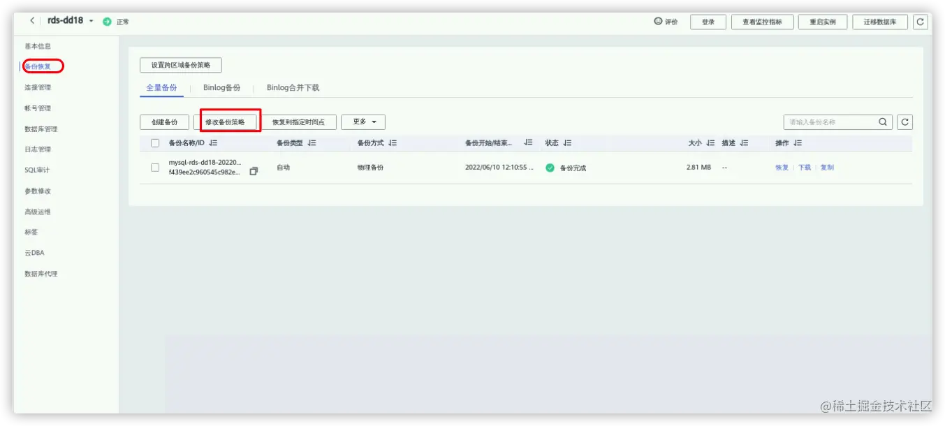 备份恢复--修改备份策略。 - 开启自动备份选项,选择保留的天数和备份时间段,默认保留7天备份数据,最高可保留2年,每5分钟自动进行一次增量备份。