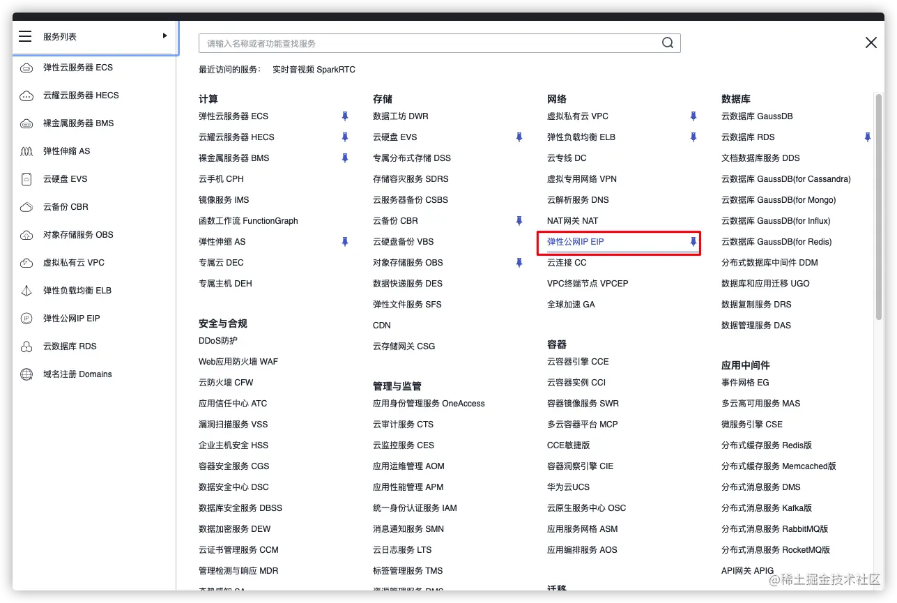 服务列表,选择弹性公网IP EIP。