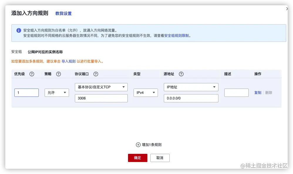 优先级1,策略:允许,协议端口端口号3306,MySQL(3306), 点击确定。到这一步云数据库的公网IP配置已经完成,下面就可以进行公网连接了。